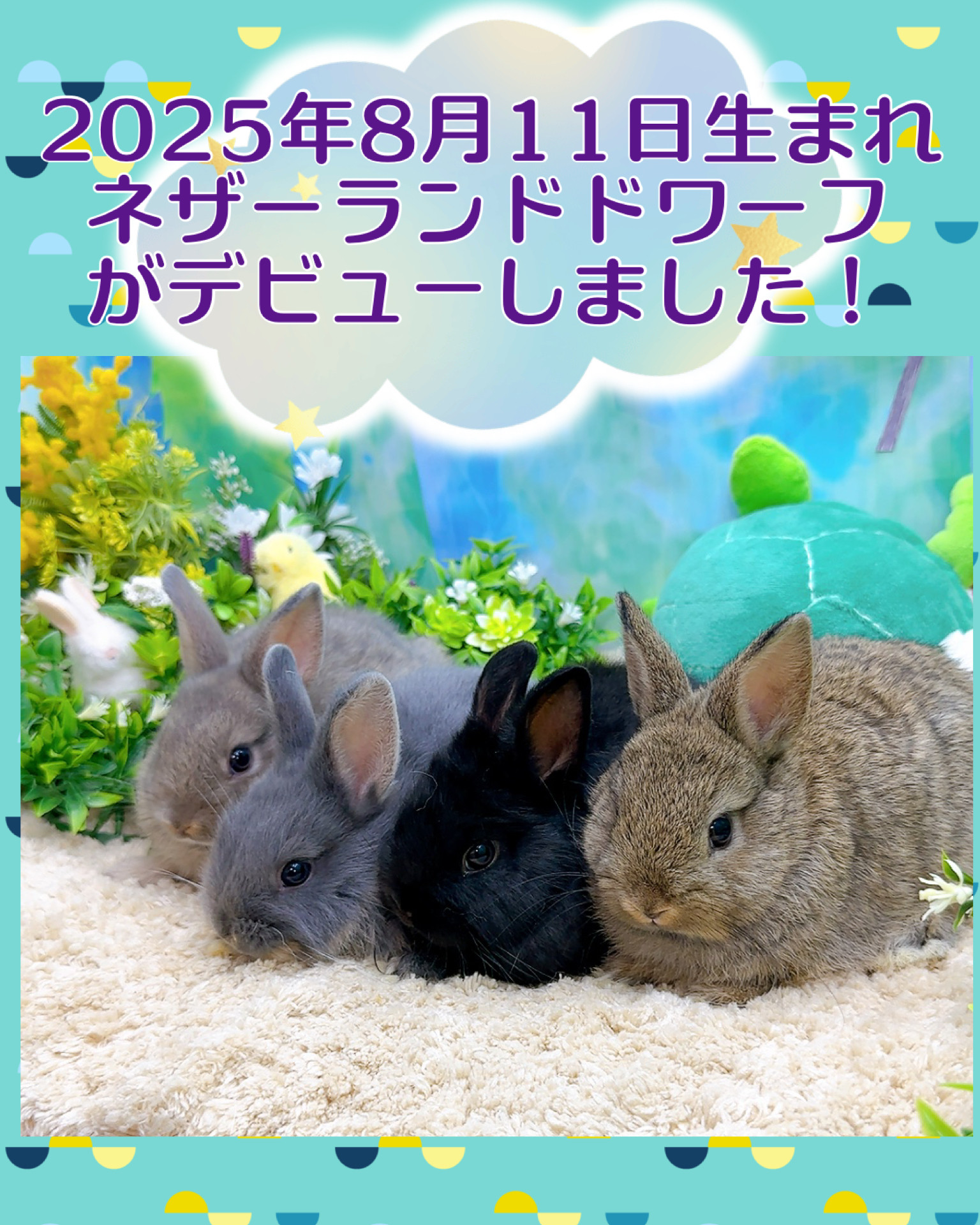 ネザーランドドワーフが5羽生まれました パパ 銀くん ママ あさひちゃん 誕生日 2024年1月14日 販売開始日 2024年2月10日 店頭にてご覧いただけます |